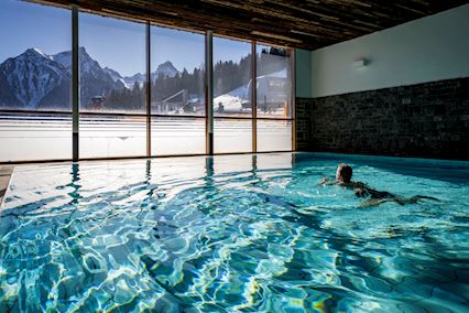 Ontspan na een actieve dag op de piste in het overdekte zwembad en de sauna, terwijl je geniet van een adembenemend uitzicht op de bergen.